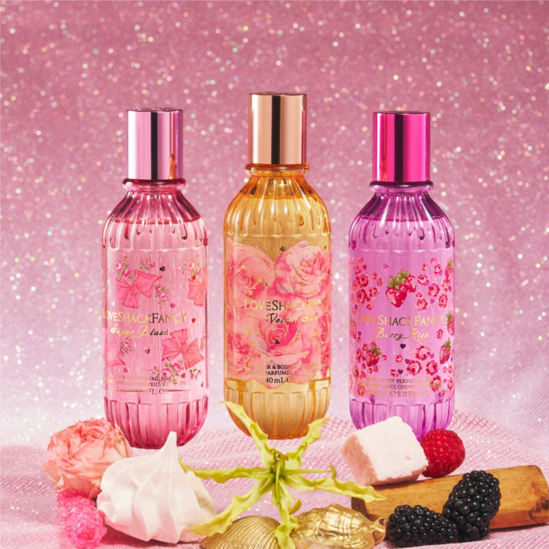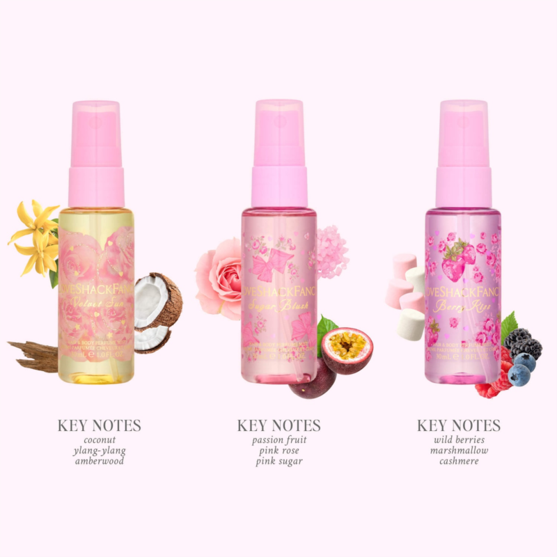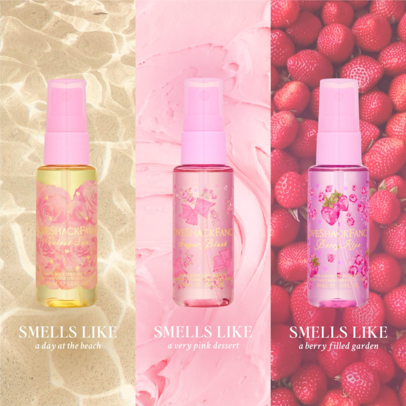 About the Fragrance: Sugar Blush: A fruity floral body mist that smells like dessert. Velvet Sun: A tropical body mist that smells like the beach. Berry Kiss: A fruity floral body mist that smells like a berry-filled garden. Created with love by perfumers Jerome Epinette and Alexandra Monet.
