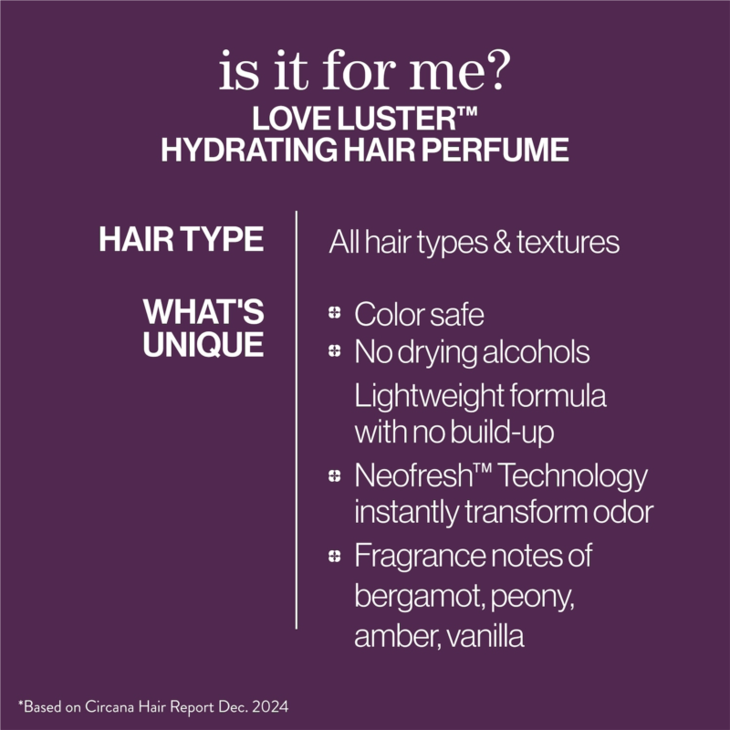 About the Fragrance: Safe for color-treated and dry hair, this hair perfume’s advanced Neofresh technology instantly transforms odors, leaving you with 5X more conditioning care versus leading alcohol-based hair fragrance among prestige fragrances.