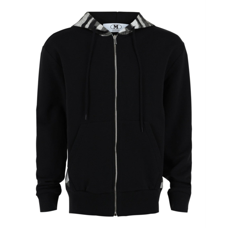 M Missoni presents a striking zip-up hoodie that seamlessly blends comfort and style. With a classic hooded neckline and a regular fit, this hoodie showcases a solid black body adorned with a vibrant zig-zag print on the hood. The piece is accented with silver-tone hardware and features two practical front patch pockets, making it both functional and fashionable. Expertly crafted from 100% soft cotton in Italy, it promises a luxurious touch to your casual and sporty attire.