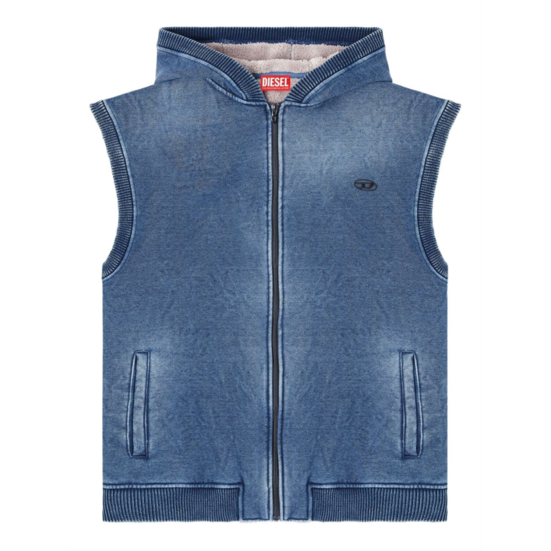 This Diesel sleeveless sweater showcases a faded blue hue, complemented by an embroidered logo at the chest. Designed with a full-zip front and a hood, it features ribbed detailing at the hem and armholes, merging casual sophistication with sporty flair. - Brand - Diesel - Product Type - Sweater - Styles - Casual, Sporty - Color - Faded Blue - Care Instructions - Dry clean only - Origin - Made in Italy