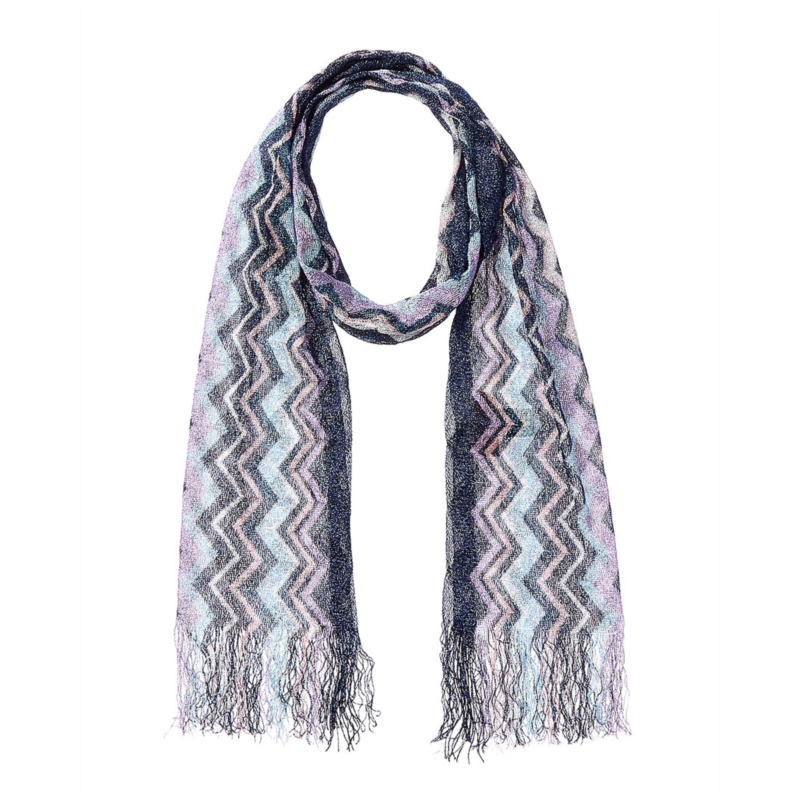 Introducing the luxurious Missoni Scarf for women, a stunning addition to your accessory collection. This designer scarf features a beautiful purple and blue color/pattern with metallic threading and fringe at both ends, adding a touch of glamour to any outfit. Made in Italy with a blend of 65% viscose and 35% polyester, this scarf measures 78.7 inches long by 15.7 inches wide. Please note that all measurements were taken by hand and are approximate, slight variations may occur. Dry clean only to maintain the quality of this exquisite Missoni scarf. Elevate your style with this statement piece today.