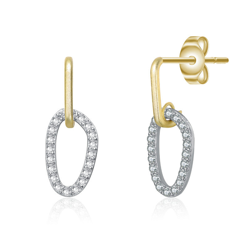 Two Tone with Clear Cubic Zirconia Oval Shaped Drop Earrings. These beautiful earrings elegance meets versatility in these stunning two-tone drop earrings. Featuring a graceful oval-shaped design, they blend 14K gold plating and white gold plating for a sophisticated finish. The shimmering, clear cubic zirconia stones enhance their brilliance, making them perfect for any occasion. Crafted with precision, they offer a secure post and butterfly back for a comfortable fit. Whether dressing up for a formal event or adding a refined touch to everyday wear, these earrings are a timeless accessoryMeasurement 24.5mm