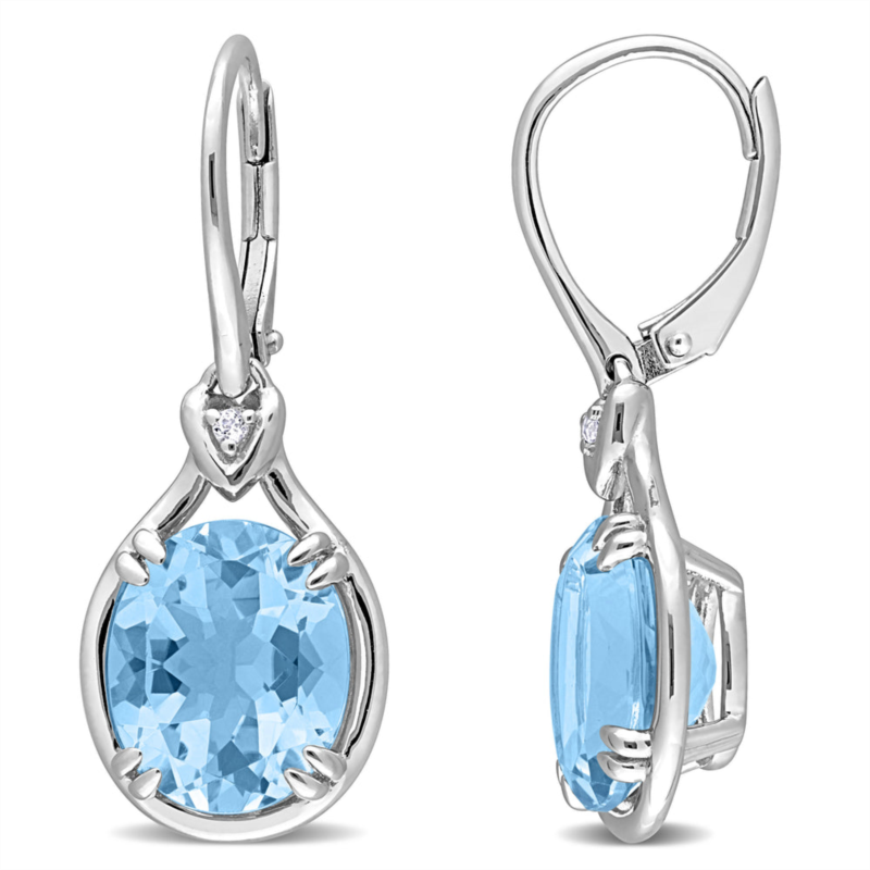 These lovely solitaire leverback drop earrings are crafted in lustrous sterling silver and feature two oval-cut, prong-set sky blue topaz (12x10mm) crowned by two round-cut, prong-set white topaz (1.5x1.5mm) gemstones in a teardrop design. Enhanced with a polished finish, these exquisite earrings are secured with leverback closures. These timeless earrings are worth treasuring.