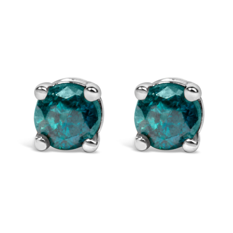 Celebrate any occasion with these classic shimmering solitaire diamond stud earrings. Fashioned in genuine .925 sterling silver, each earring showcases a sparkling color treated round cut diamond solitaire. They come in your choice of fancy blue and fancy green color. Dazzling with a bright polished shine, these post earrings secure comfortably with friction posts and butterfly backs. These classic earrings make a great gift for any special occasion! Whether worn for daytime glamour or evening sparkle, these studs are gorgeously versatile. Coordinate these earrings with your favorite diamond necklace or other diamond jewelry to create a complete elegant ensemble.