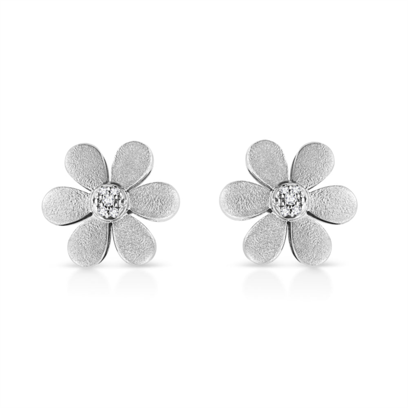 Celebrate your blooming love with these adorable diamond flower earrings made from .925 sterling silver and given a matte finish. Charming style for your sweetheart, these sterling silver floral earrings are embellished by a cluster of 10 pave set single cut accent diamonds at the center. These blossoms closes with a secure clasp. Total diamond weight is 1/20 ctw.