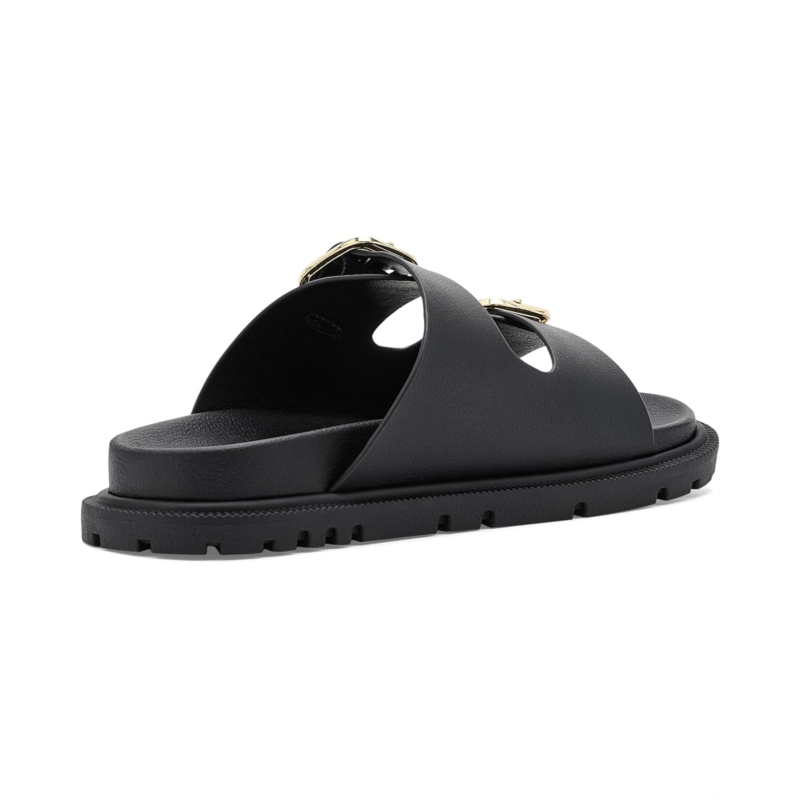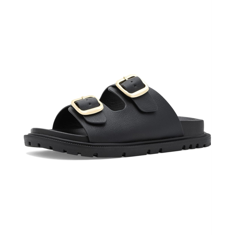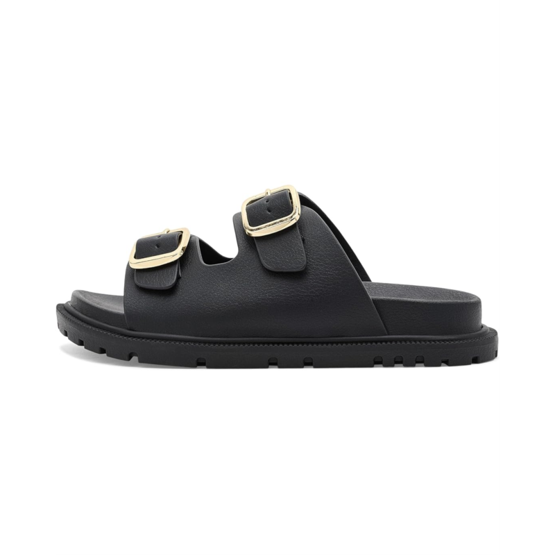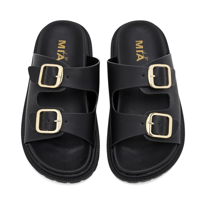 - The MIA Kids Footwear Elodee Too is a trendy double-strap slide designed for everyday wear. Made with a faux leather upper and lining, it features adjustable double buckles for a secure fit and a tumbled polyurethane insole for added comfort. The thermoplastic rubber outsole provides durability and traction.