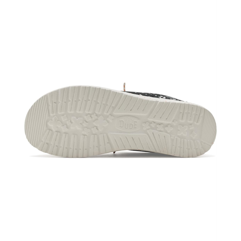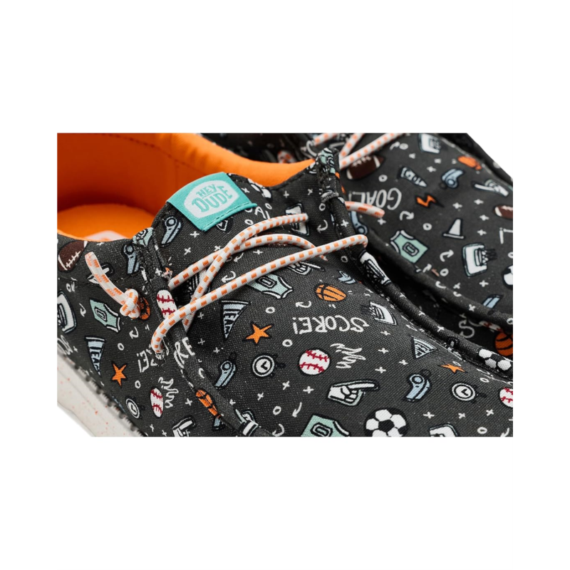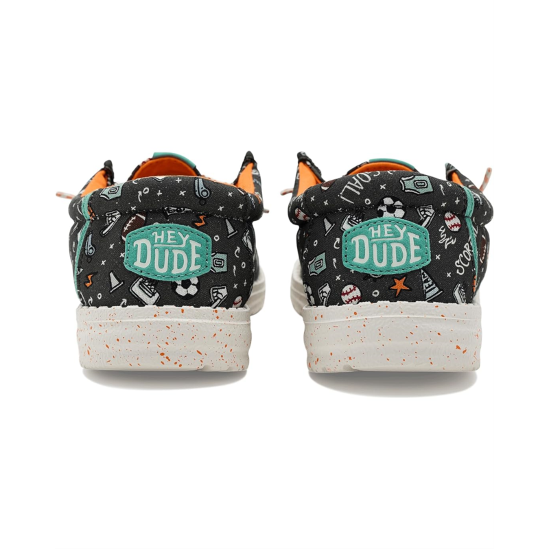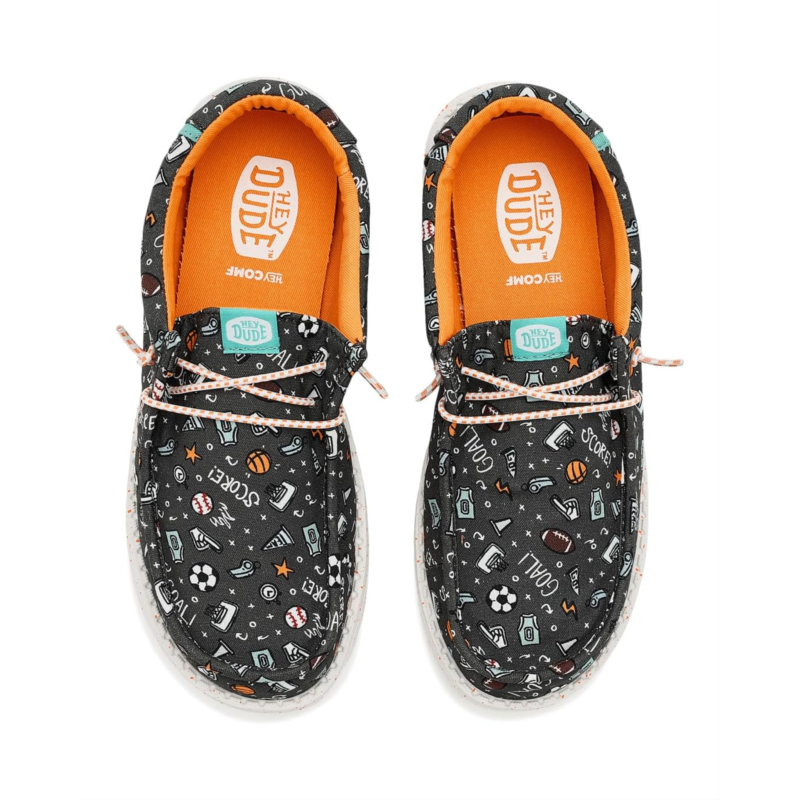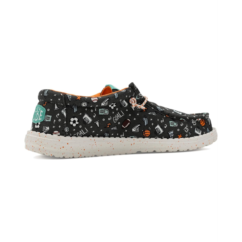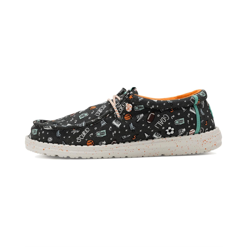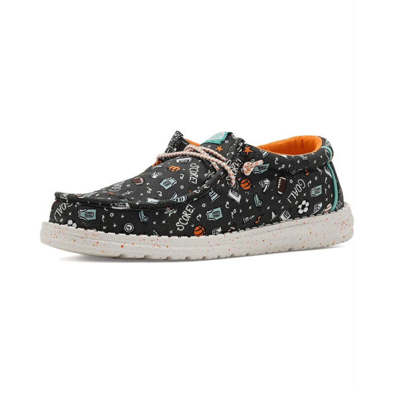 - Lightweight, playful, and built for everyday adventures, the Hey Dude Kids Wally Print Sneakers add fun style to your classic look. Designed with an easy-on feel and a comfy fit, these sneakers feature an allover printed design that brings a playful touch to everyday wear. Flex & Fold technology supports healthy feet with its unique shape, giving complete freedom of movement.