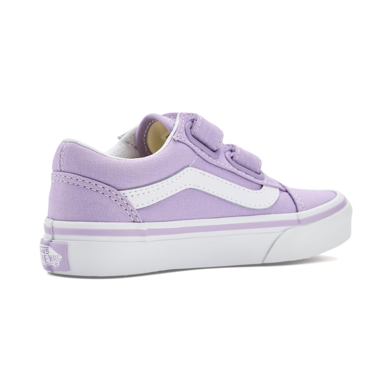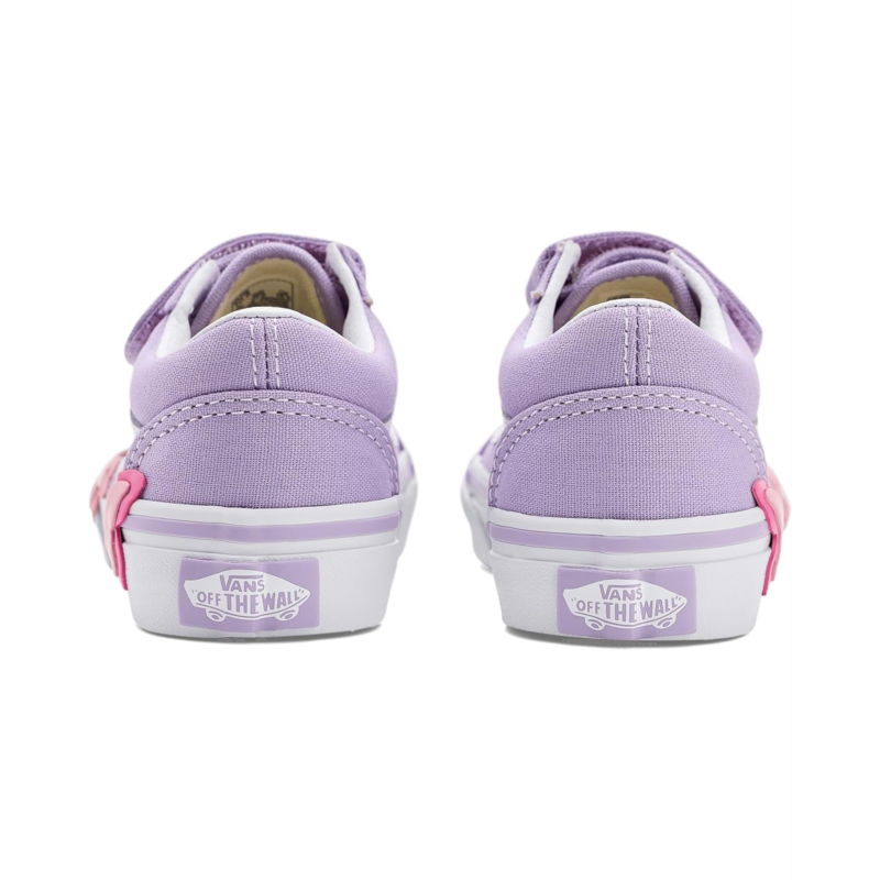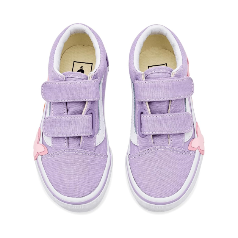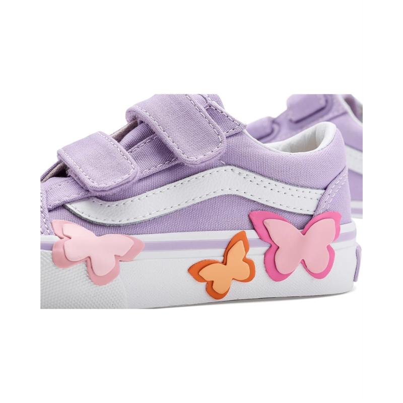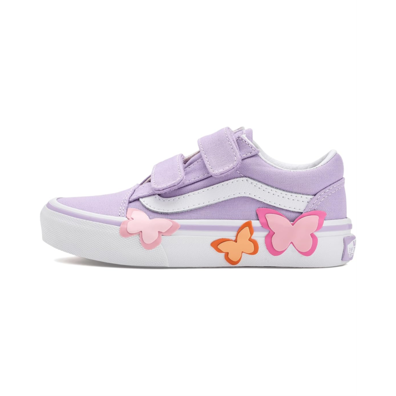 - The Vans Kids Old Skool V Butterfly shoes are low-top sneakers with a padded collar for enhanced support and comfort. Styled with a butterfly detail, their sturdy suede and canvas upper has dual hook-and-loop straps for effortless wear. These sneakers are made of a rubber insole and cotton lining. Dress up your kid for any occasion with these fashion sneakers.