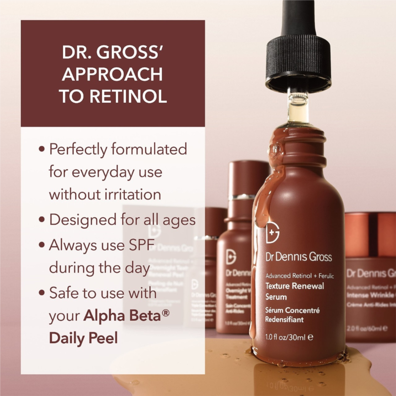 - Retinol: A vitamin A derivative that supports collagen production to reverse visible signs of photoaging and improve the appearance of fine lines and wrinkles while caring for UV-induced free-radical damage; it also reduces the overproduction of blemish-causing sebum and visibly fades dark spots.