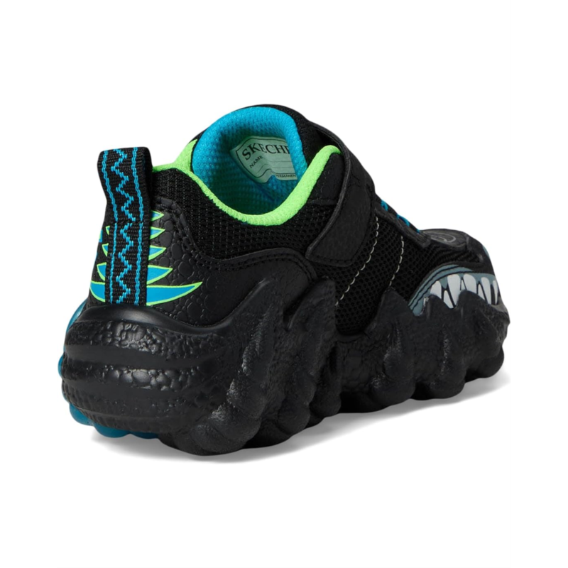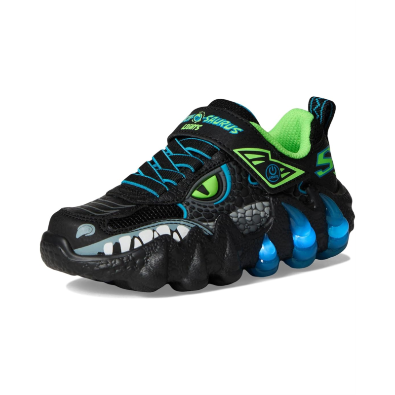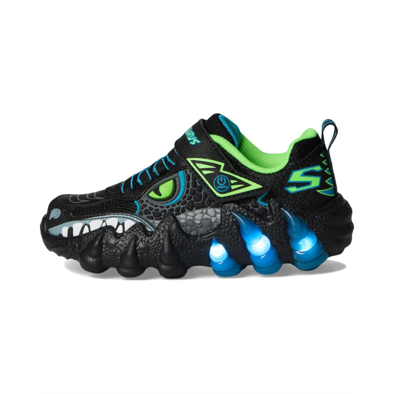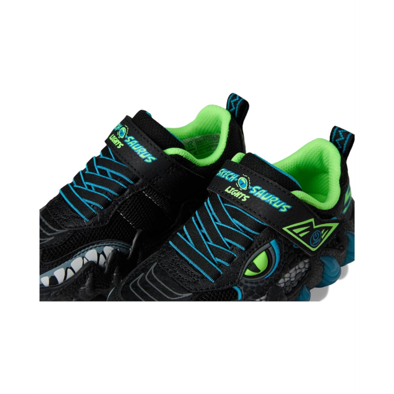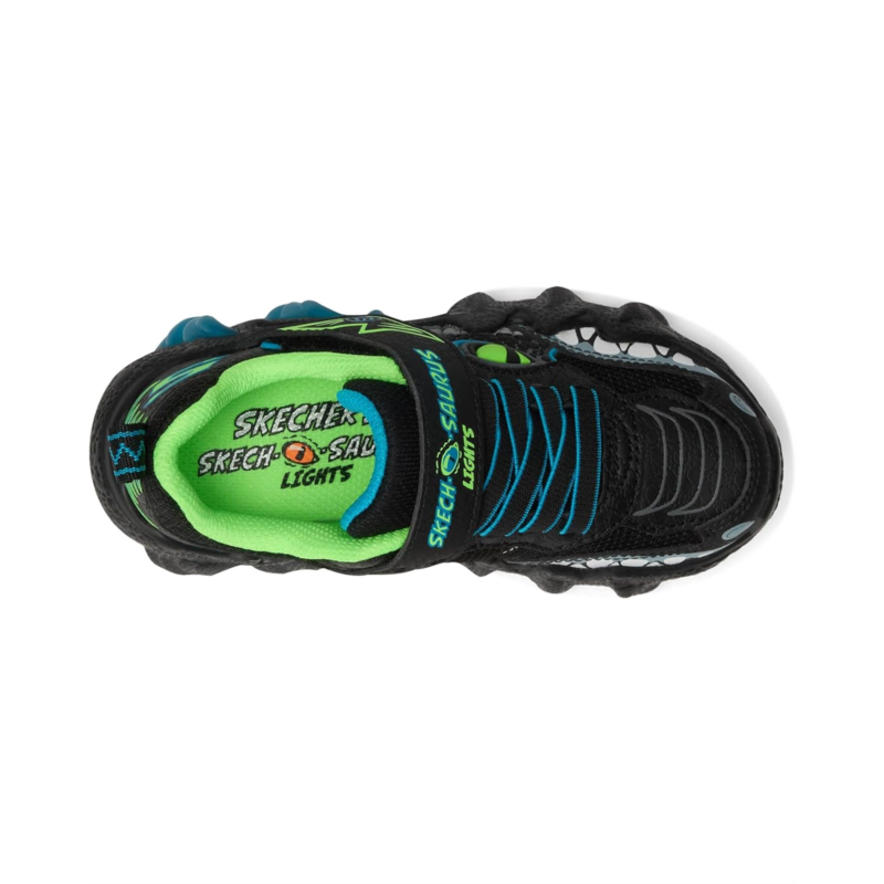 - Dino-mite kicks for dino-mite kids! The SKECHERS KIDS Skech-O-Saurus Lights 2.0 will have your little ones stomping with joy. Designed for little adventurers, these sneakers combine dinosaur style and unbeatable comfort. The vibrant reptilian-themed upper, crafted from faux leather and breathable mesh, brings their wildest imaginations to life. Featuring an easy-on, easy-off adaptive closure, kids can enjoy a customized fit that keeps up with their playful spirit. The light-up feature, activated by a simple button, adds an extra sparkle to every stomp, while the shock-absorbing T-Rex midsole provides the support needed for all-day adventures. With cotton lining and a cushy EVA insole, these shoes keep little feet comfy and ready for anything.