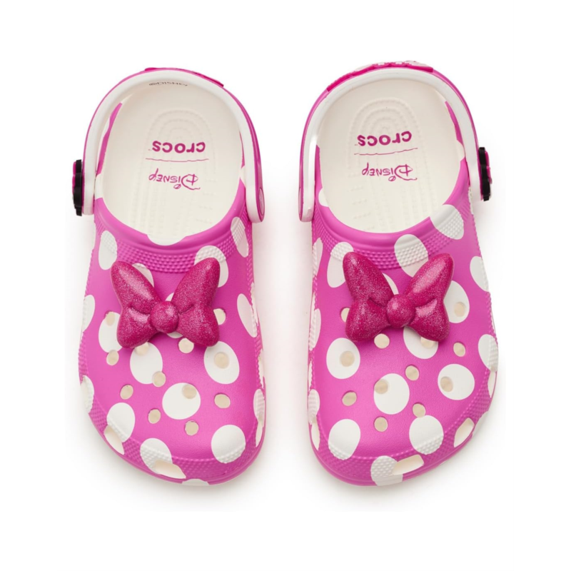 - Yoo-hoo, it''s the Minnie Mouse Classic Clog from the Disney''s Mickey & Friends collection from Crocs Kids! This adorable Classic Clog is designed with Minnie Mouse''s iconic style in mind, featuring a pink polka dot print topped with a big, pink, glitter bow on each shoe! Minnie Mouse''s face adorns each of the rivets with her signature across the backstrap.