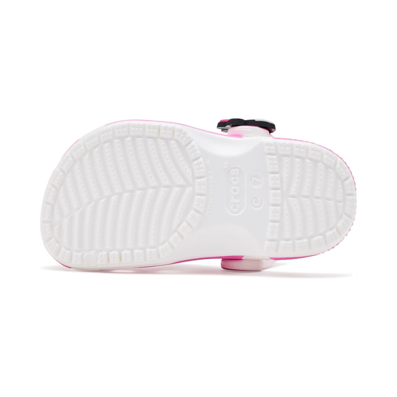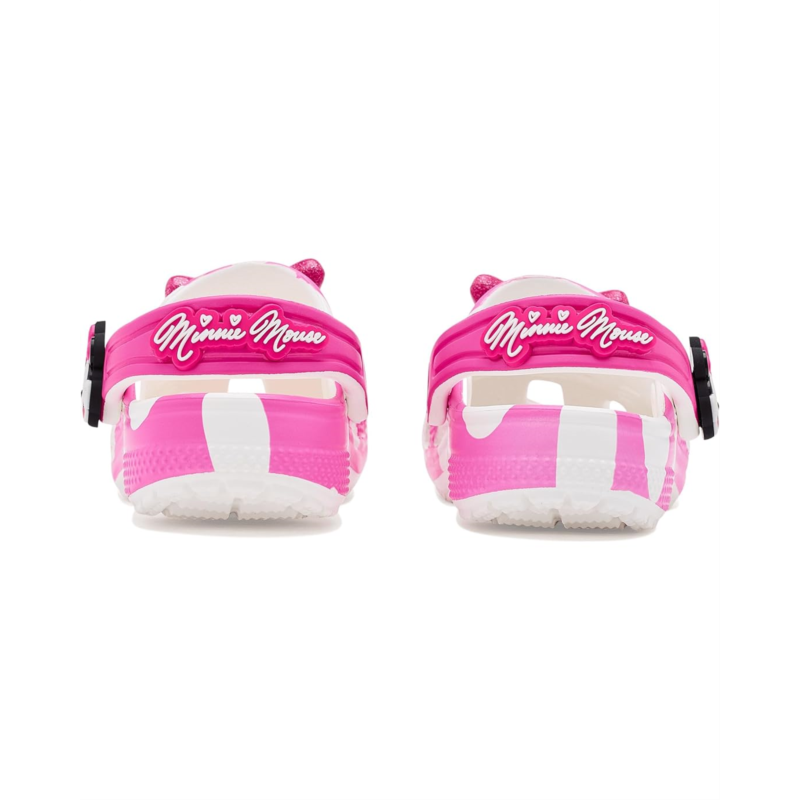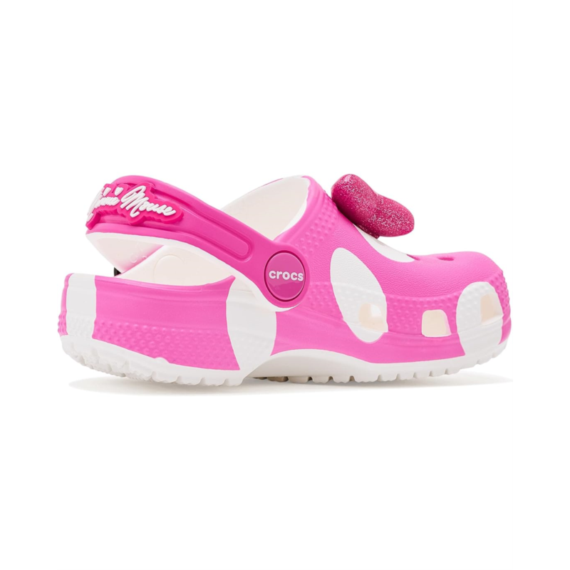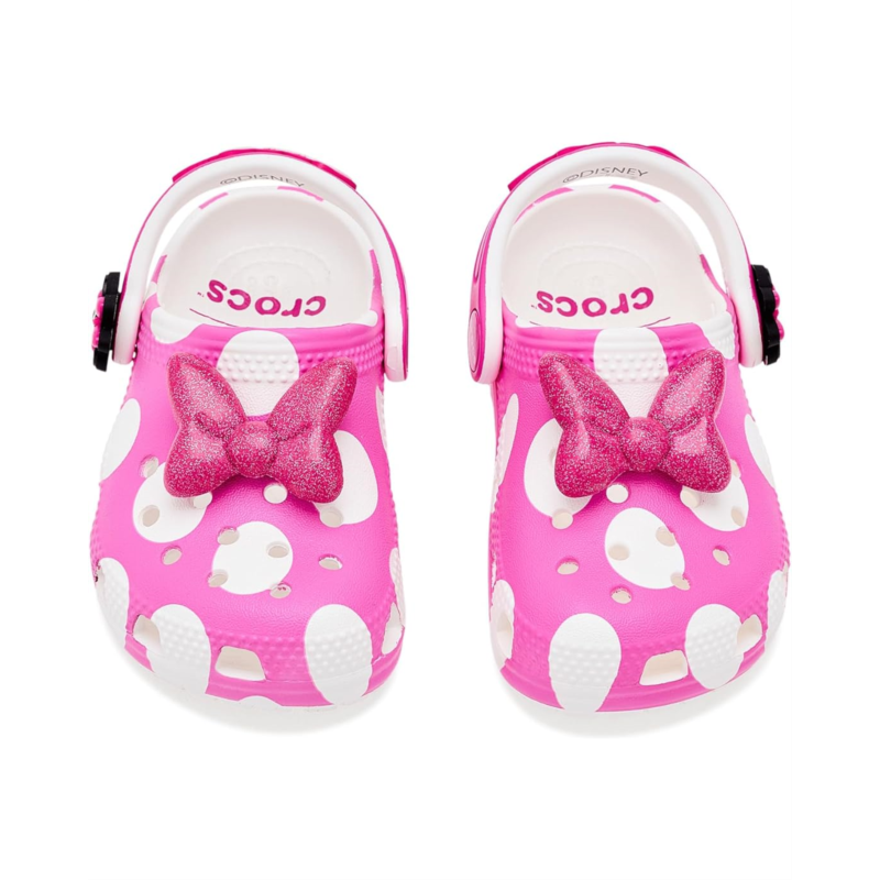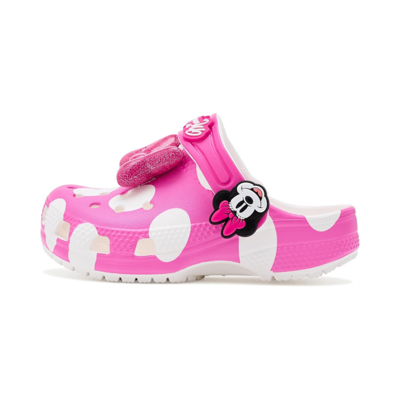 - Yoo-hoo, it''s the Minnie Mouse Classic Clog from the Disney''s Mickey & Friends collection! This adorable Classic Clog is designed with Minnie Mouse''s iconic style in mind, featuring a pink polka dot print topped with a big, pink, glitter bow on each shoe! Minnie Mouse''s face adorn each of the rivets with her signature across the back-strap.