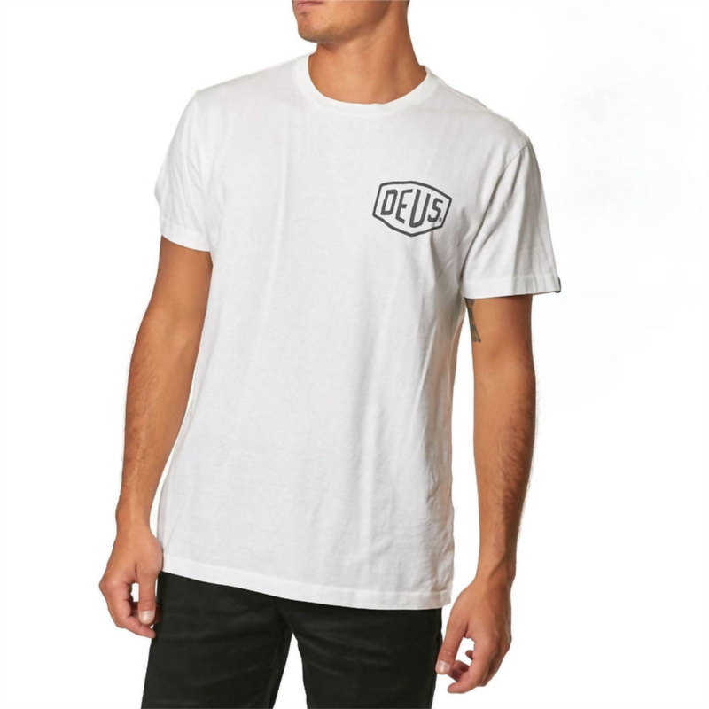 Men''s regular fit white tee features an original Deus front and back panel print on soft 190gsm organic cotton jersey.