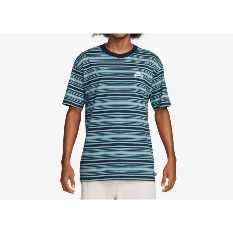 Introducing the Mens SB Max Stripe Shirt by Nike, a stylish addition to your streetwear collection. This short sleeve tee is crafted from 100% midweight cotton, offering a soft structure with the signature Max90 fit that features slightly longer sleeves and a roomy feel through the chest and body. Originating from imported materials, it boasts a ribbed crewneck collar and a distinctive striped pattern in Turquoise, complete with the iconic Nike SB logo on the left chest. Easy to maintain with a machine wash care routine, this shirt is a versatile choice for your vacation wardrobe.