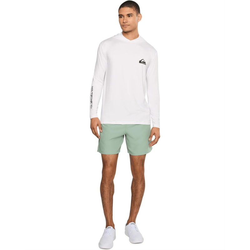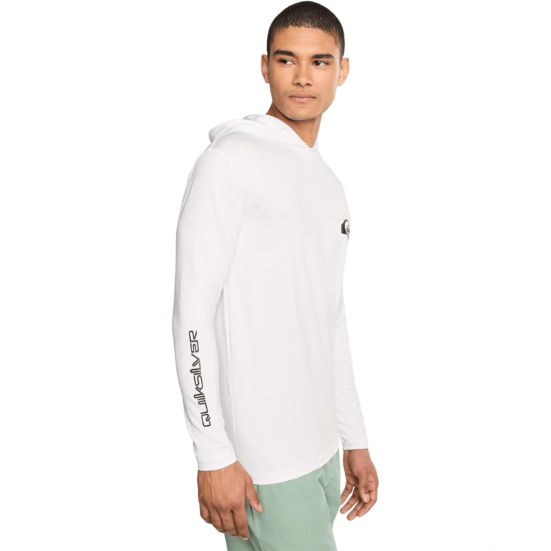 - Born in the lineup: The Quiksilver Everyday Hooded Surf Tee. Crafted in stretchy, sun-guarded recycled Stretch Flight fabric, it delivers lightweight performance with eco-conscious appeal, keeping you protected and comfortable from beach breaks to boardwalk strolls. The loose fit offers effortless freedom of movement, perfect for paddling out or kicking back after a long surf. A classic crew neck and long sleeves provide versatile coverage, while the easy pull-on design makes it your grab-and-go favorite. Mountain wave graphics across the chest with bold sleeve font add that unmistakable signature style.