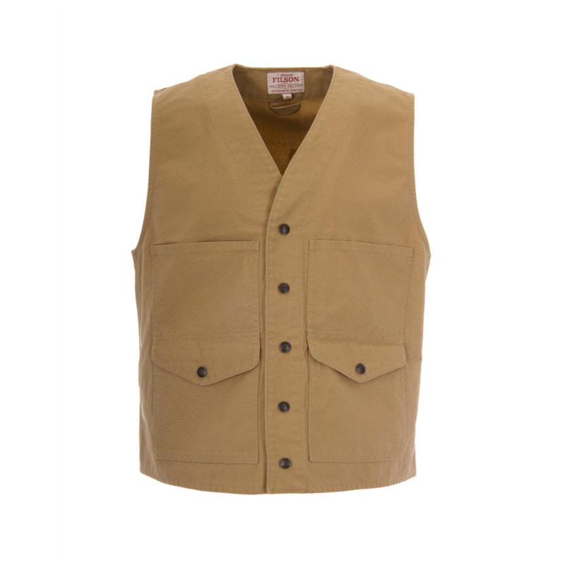 This sleeveless gilet from Filson highlights outstanding craftsmanship and a rugged, utilitarian style. Constructed from 100% waxed cotton, it offers a square cut for comfort. The full central button closure and four front patch pockets, along with extra compartments, boost its practicality. Unlined for breathability, this piece is ideal for outdoor adventures and modern mens wardrobes. - 100% waxed cotton material - Square cut design - Full central button closure - Four front patch pockets - Additional compartments for storage - Unlined for breathability