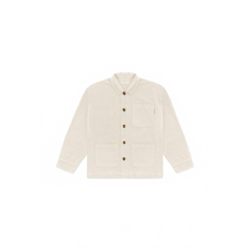 Presenting the Men''s Wordmark Chore Coat by Museum of Peace & Quiet, a streetwear essential in a bone hue. With long sleeves and a collared neckline, this lightweight shirt jacket is crafted from mid-weight terry cloth, offering stretch and comfort. The coat features a button placket and practical patch front pockets. Made from 100% cotton, it is perfect for travel, especially during the fall season, and is imported from China. Care - Machine wash cold and tumble dry.