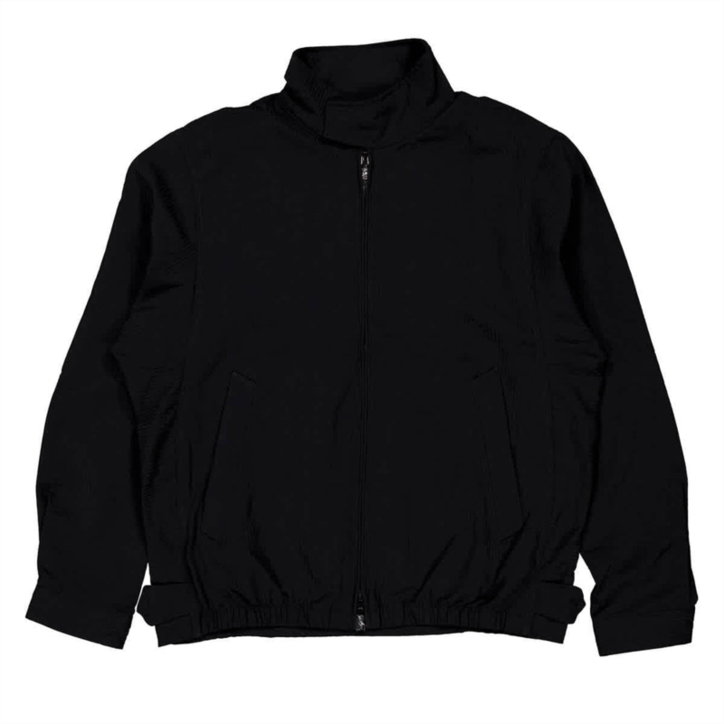 Emporio Armani Mens Outerwear. Fashion category - Coats & Jackets. SKU - EM000993-AF13674-UB118. Color - Navy Blue. Emporio Armani Nylon Seersucker Blouson Jacket. This blouson jacket, crafted from featherweight nylon, features a zip closure and a press-stud collar. It showcases Armanis signature seersucker fabric, known for its dynamic, crinkled texture that adds a distinctive edge and lightweight comfort. Designed with an urban appeal, the jacket includes long sleeves with press-stud cuffs, side welt pockets secured with press-studs, and an elasticated hem. Adjustable side straps with press-stud detailing at the sides. 100% polyester.