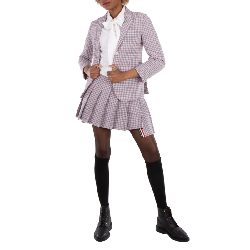 Thom Browne Ladies Outerwear. Fashion category - Coats & Jackets. SKU - FBC700H F0499 960. Thom Browne Ladies Small Check Cotton Jacket. Crafted from cotton crepe, this jacket features a pointed collar, single-breasted button closure, a breast pocket, and two front flap pockets. It is designed with padded shoulders, buttoned cuffs, and signature grosgrain detailing on the back collar. The jacket also includes a back central vent and is partially lined. Made in Italy.