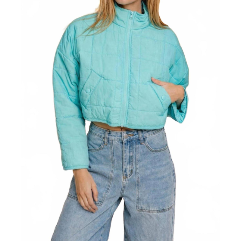 Cozy, cute and timeless. The puffer jacket that will keep you warm all season long.Enhance your winter wardrobe with the LE LIS Daydream Cropped Puffer, a chic statement layer in vibrant aqua. This puffer features long sleeves, a trendy quilted design, and a high zip collar, offering both style and comfort. Made from soft polyester, it comes with oversized front snap pockets for functionality. Complete with a zip closure, this lined jacket is crafted in China and embodies the perfect Scandi Style for the season.