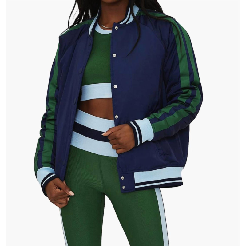 Make any outfit instantly cool by pairing it with this bomber jacket.The Flight Jacket brings a bold athletic edge to outerwear with its varsity-inspired design and rich color palette. Crafted in deep navy with striking green stripe detailing down the sleeves, it features ribbed cuffs, a striped collar, and a snap-button front for a classic, collegiate finish. This structured silhouette layers effortlessly over sporty ensembles, adding a refined, street-ready touch to any look.