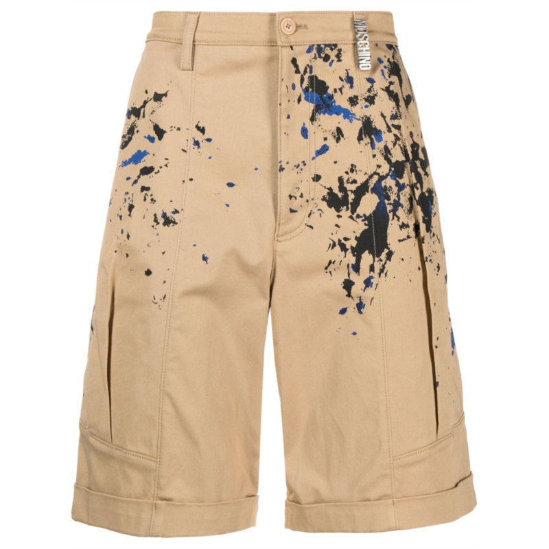 Expertly crafted by Moschino, these shorts showcase a sand beige stretch-cotton twill adorned with an artistic painterly print in striking black and blue hues. The design features refinement through pleat detailing, belt loops, and a concealed fly with button fastening. Practicality meets style with two side slit pockets and two rear button-fastening pockets, while a chic turn-up hem completes the look. - Material - Stretch cotton twill - Size - Standard fit - Color - Sand Beige with painterly print - Care - Dry clean only - Origin - Made in Italy