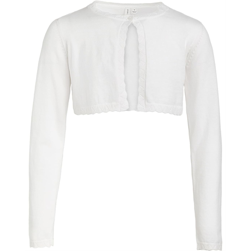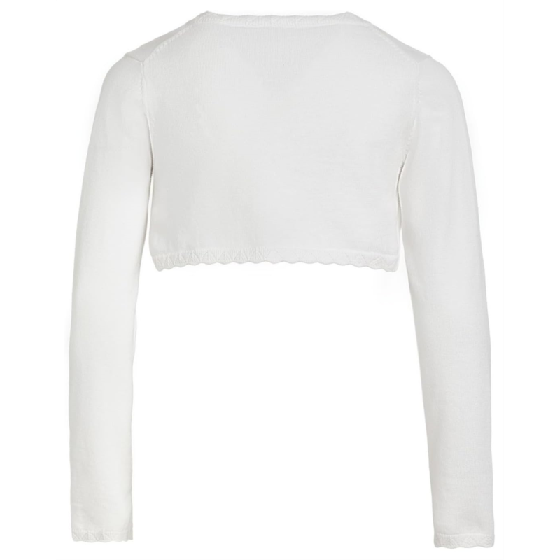- Add a touch of timeless style to any outfit wearing the Janie and Jack Cropped Cardigan, the perfect layering piece for polished everyday looks and special moments alike. Designed with long sleeves for comfortable coverage, this charming cardigan brings both warmth and style to your childs wardrobe. The classic button-front closure makes dressing easy while adding a refined, put-together finish. Crafted from soft fabric, it feels gentle against delicate skin, ensuring all-day comfort whether worn indoors or outdoors. The cropped silhouette adds a trendy twist, making it ideal for pairing with dresses, skirts, or high-waisted bottoms. What truly makes this piece stand out is the delicate scalloped crochet trim, which adds a sweet, handcrafted look that elevates the entire design.