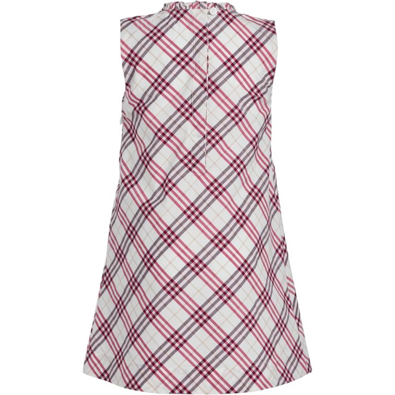 - The Burberry Kids Yvette Dress is a sleeveless tank dress featuring a checkered pattern for a classic look. Made from cotton, it takes your kids comfort to the next level. This patterned dress is designed with a round neckline, an above-the-knee length, and a buttoned back closure. Cut in an A-line silhouette, this mini dress is styled with a smocked bodice for a perfect fit.