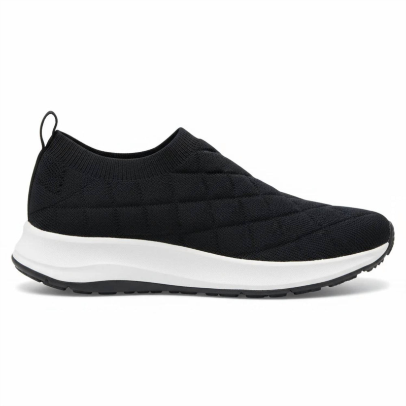 Cute, functional, and comfortable. These sneakers check all the boxes.Introducing the FitFlop F-mode Flow Quilted Slip-on Sneakers, a perfect blend of style and functionality for the modern woman. Featuring a quilted-knit, polyester upper and lining, these sneakers offer breathable comfort with a slip-resistant rubber sole for various terrains. Ergonomically engineered with a Microwobbleboard midsole, this design ensures optimal body alignment, natural movement, and energy conservation with its triple-density cushioning. Recognized for promoting good foot health, these sneakers also offer natural arch support and a flat heel of 1'' & under, making them ideal for travel and athleisure occasions.