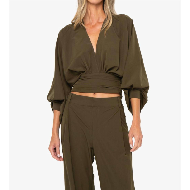 Show a little skin in this cute and casual crop top.Elevate your wardrobe with the Eleonor Three-quarter Sleeve Top by JBQ, a minimalist masterpiece in a stunning moss hue. Crafted from a 90% nylon and 10% spandex blend, this solid, cropped top offers a flattering V-neckline and wide, banded cuffs on its three-quarter sleeves. Made in the USA of imported materials, it features a side zip closure for a seamless fit. Care for this elegant piece by washing it cold. The model is 5''9'' and is wearing a size small. Perfect for a spring dinner party or a sophisticated Thanksgiving gathering.