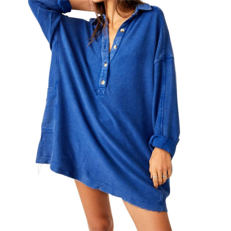 The perfect long sleeve tee that goes with just about anything.The Willow Polo Top by Free People is the perfect blend of preppy style for a holiday party. This solid-colored, rinsed cobalt tee features long sleeves and a classic collar neckline for a sophisticated edge. Made of 100% Cotton, it has a comfortable 33-inch garment length and includes practical pockets. Closure - Button closure. Care - Machine wash, tumble dry. Ideal for adding an elegant touch to your fall wardrobe.