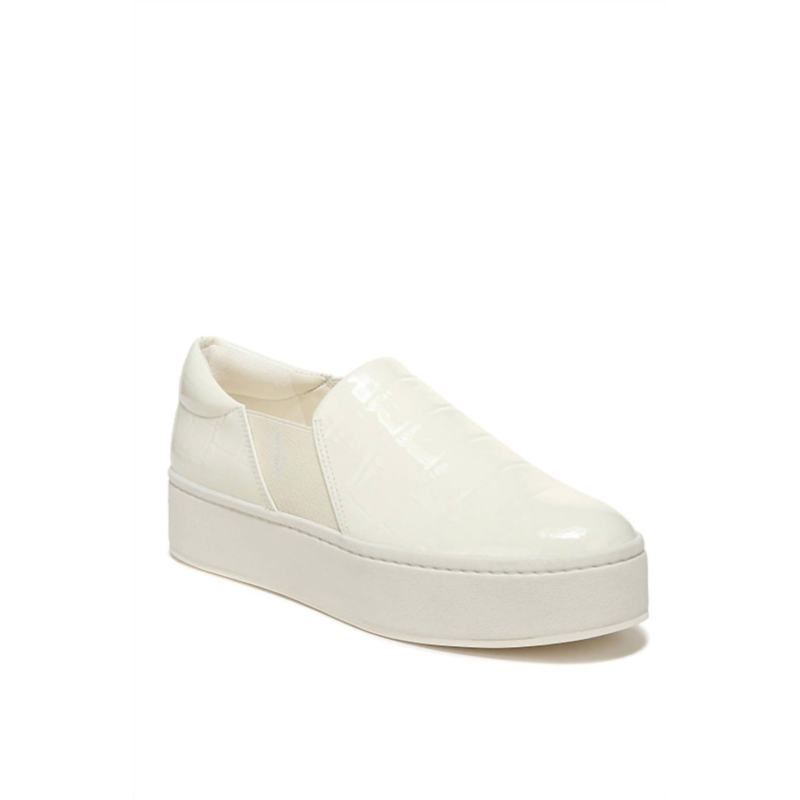 Cute, functional, and comfortable. These sneakers check all the boxes.Elevate your casual look with the Womens Warren Croc Stamped Sneaker by Vince, showcased in a chic Marble Cream hue. These slip-on sneakers feature a butter-soft leather construction with a round toe and a chic flat heel, enhanced by a cushioned insole and padded heel collar for ultimate comfort. Designed with a hollowed 1.63 double-thick rubber platform sole and elastic side goring, they ensure both style and lightweight functionality. Slip into sophistication with these effortlessly stylish sneakers for women.