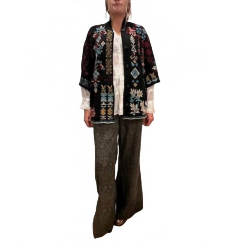 Stylish and feminen, this cape is a perfect addition to any outfit during the cooler months.This one-of-a-kind sweater is perfect for any occasion, letting you showcase your boho vibes! The sweater features mid-length sleeves, a button closure, and convenient side pockets. The intricate embroidery details are sure to impress!The model is 510 and wearing a size Medium.Dry Clean