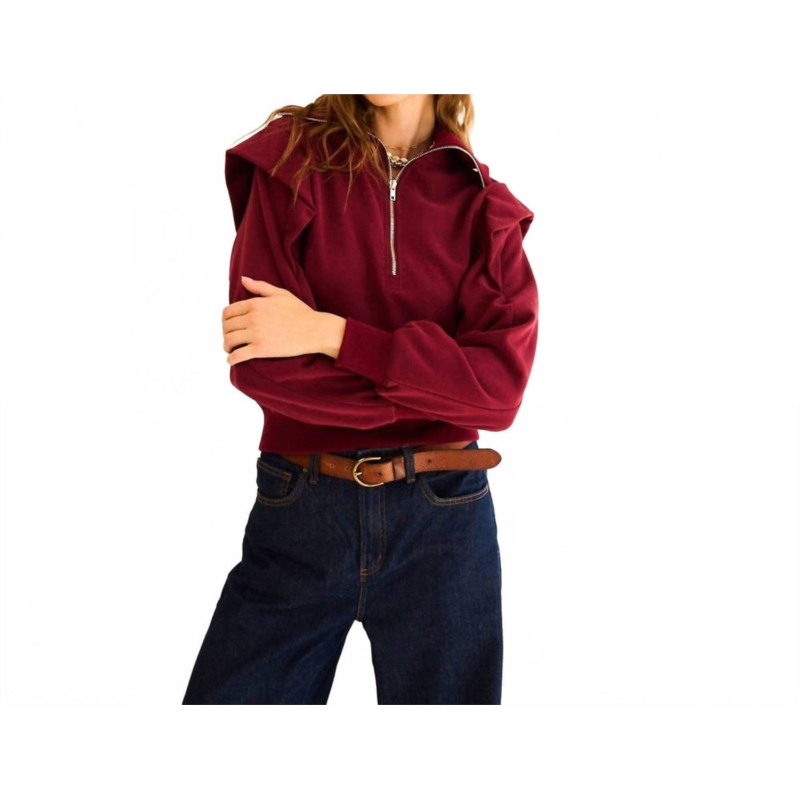 Whether you''re running around town or lounging at home, this sweatshirt works for both.Introducing the Mar Zip-Up Ruffled Sweatshirt by The GREii, a perfect blend of style and comfort for your fall wardrobe. This women''s sweatshirt features long sleeves and is crafted from a solid, rich burgdy French terry blend of 86% cotton and 14% polyester. Highlighting a chic half-zip closure, it boasts ruffle accents on the shoulders and a sporty rib collar, creating a modern, feminine vibe. Care is made easy with machine wash and tumble dry instructions, making this an ideal piece for a maximalist trend at your next dinner party.