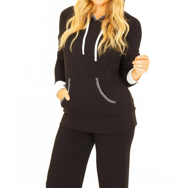 Cozy fabric, impeccable design - Meet the sweatshirt that you''ll never want to take off.Introducing the Detail Hoodie with Pocket by French Kyss, a must-have for your activewear collection. Designed in a chic black and white, this solid pattern hoodie features long sleeves and a convenient pull-on closure. Its viscose, polyester, and elastane blend ensures comfort while the garment, hitting at the hips, offers a flattering fit. Imported with delicate stitch detail, it is ideal for fitness or workout sessions. Care - Delicate hand wash or dry clean.