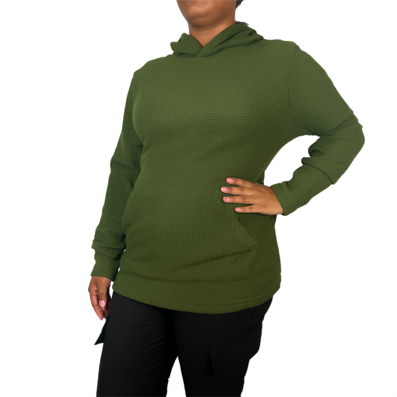 Soft Waffle Knit Fabric ? Crafted from a premium 65% cotton and 35% polyester blend for lightweight warmth, breathability, and lasting comfort. The textured waffle design adds a cozy, stylish touch perfect for everyday wear. Comfortable Loose Fit ? Features a classic crew neck and long sleeves for a relaxed yet flattering look. Designed with a kangaroo pocket for convenience and easy layering, making it ideal for casual, lounge, or outdoor use. Easy Care & Quality Construction ? Imported and made with durable stitching for long-term wear. Machine washable in cold water for effortless maintenance and long-lasting softness. Soft Waffle Knit Hoodie Loose Fit Kangaroo Pocket Crew Neck Long Sleeve No Adjustable Drawstring Material - 65% cotton , 35% Polyester