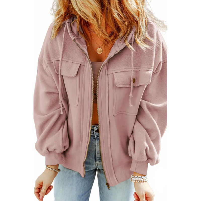 Whether you''re running around town or lounging at home, this sweatshirt works for both.The Zip & Go Cozy Sweatshirt by Little Daisy Closet combines style and comfort in a dusty pink hue, perfect for a minimalist fall wardrobe. This women''s jacket features long puffed sleeves with fitted wrist cuffs and a drawstring hood, offering both warmth and versatility. Designed with practical flap chest pockets with snap details and a straight hem that falls to hip length, this piece ensures a flattering fit. Closure - Zip closure. Ideal for a dinner party or casual outings, this sweatshirt is a must-have addition to your collection.