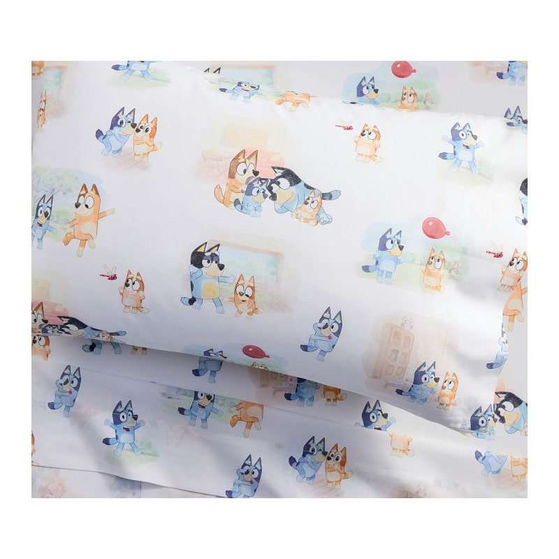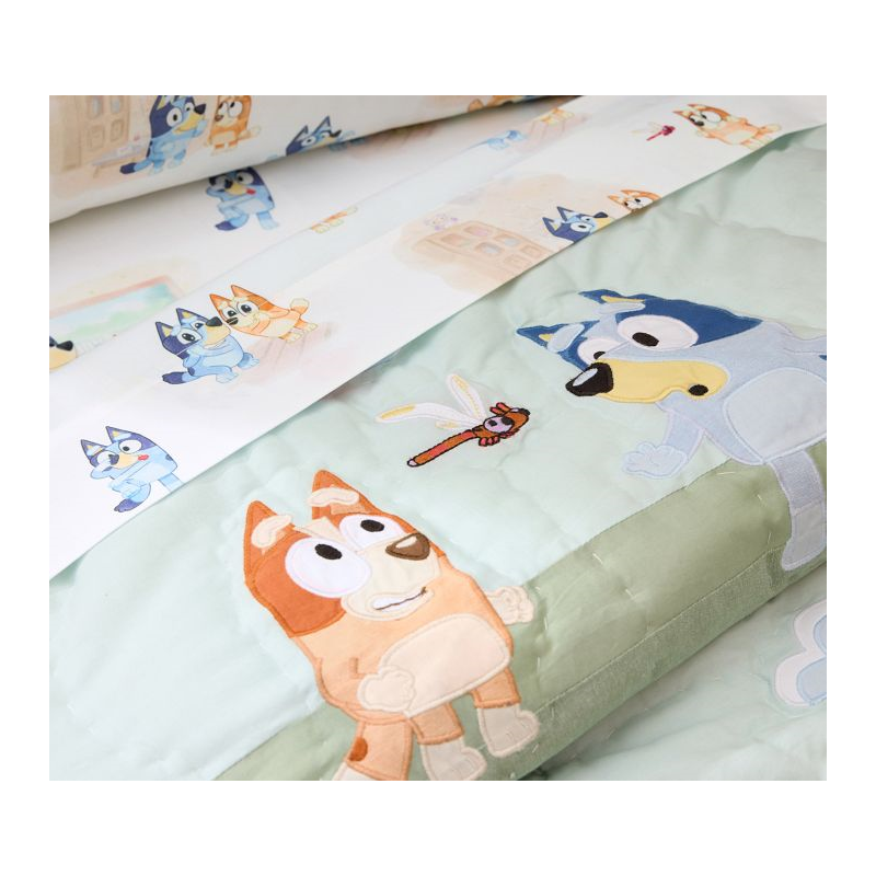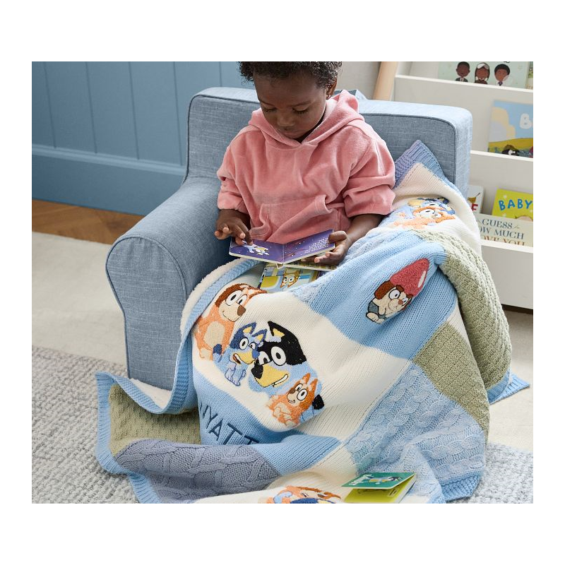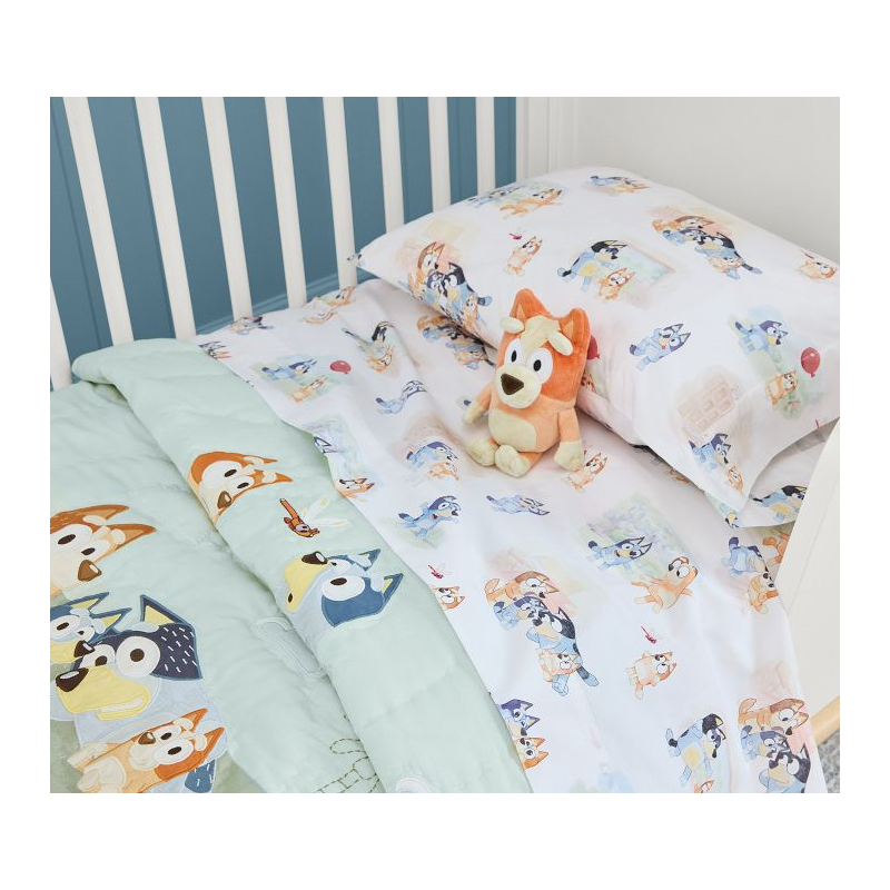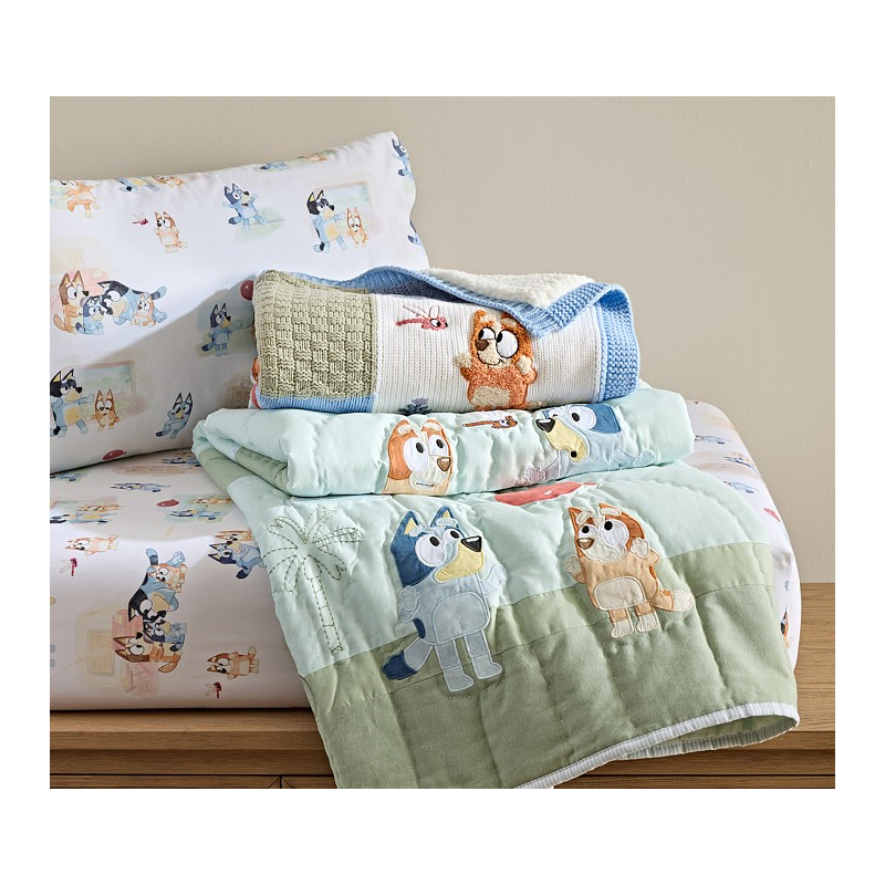 Blueycharm to bedtime! Featuring beloved characters from the series, this colorful bedding set is a fan favorite for little ones. They’ll snuggle into the playfully printed organic cotton sheets and cozy quilt tailored from cotton for total comfort. Plus, they’ll love to wrap themselves up in the snuggly heirloom blanket.