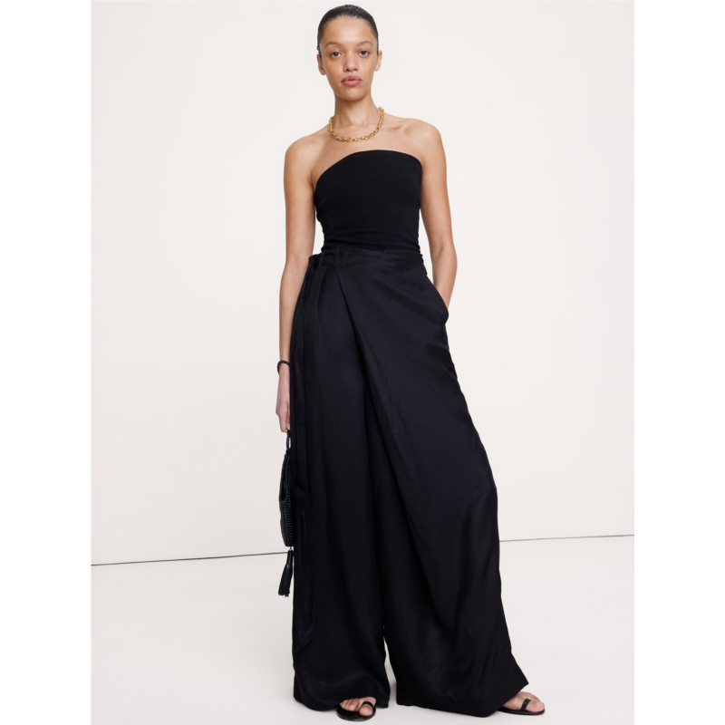 - Everything about these pants is extra: the super-wide leg, the foldover wrap front, and the luxe viscose-linen fabric?one we love for its lightweight and beautiful drape.