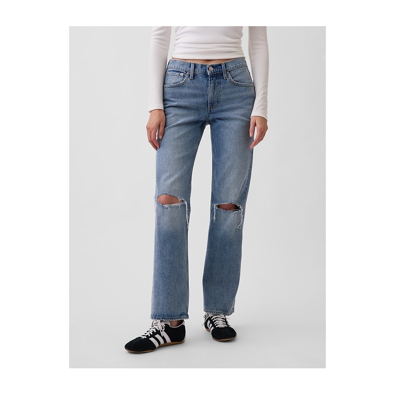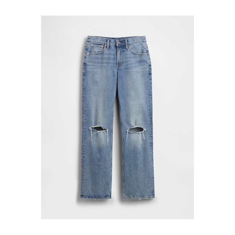 - Look: A distressed five-pocket jean in a medium indigo wash.