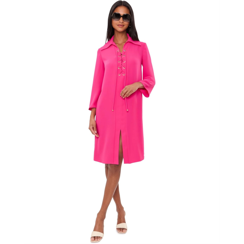 - The Trina Turk Collared Lace-Up Dress is your go-to for laid-back sophistication with a modern twist. Designed in a relaxed fit, this dress drapes beautifully for all-day comfort while still looking refined and intentional. The flattering V-neckline is elevated with delicate pleated detailing that adds soft texture and visual interest, making it anything but basic. Cap long sleeves offer just the right amount of coverage, striking the perfect balance between casual and polished. Falling above the knee, the silhouette feels fresh, versatile, and easy to style from day to night. A pull-on design keeps things effortless, no fuss, no zippers, just instant style.
