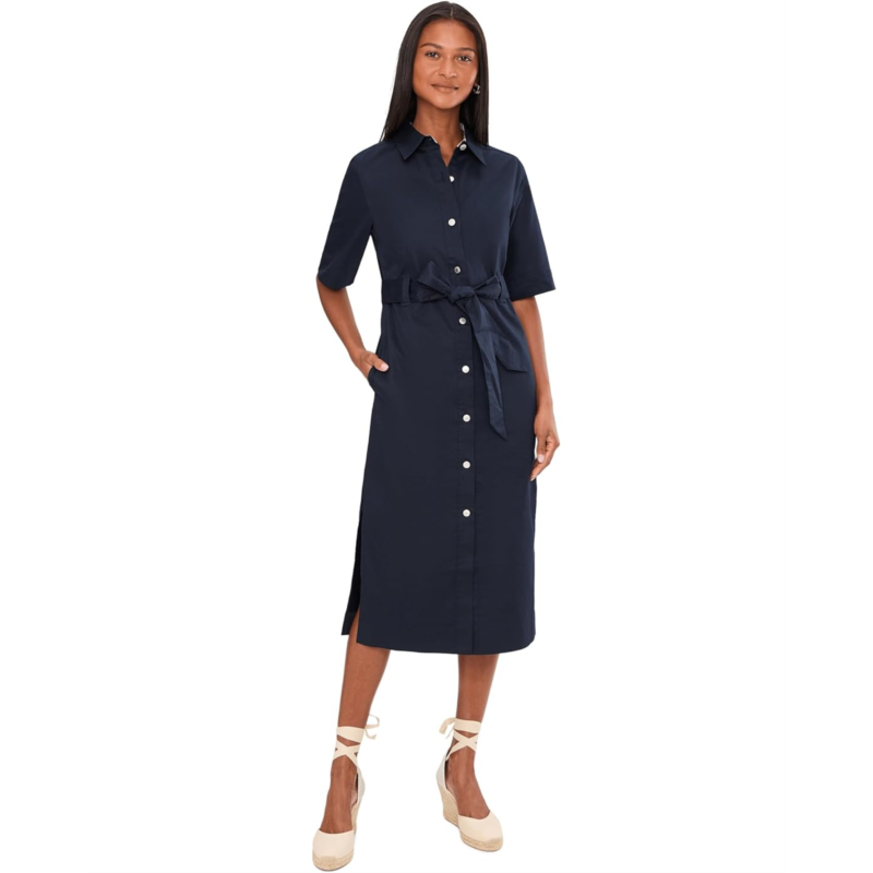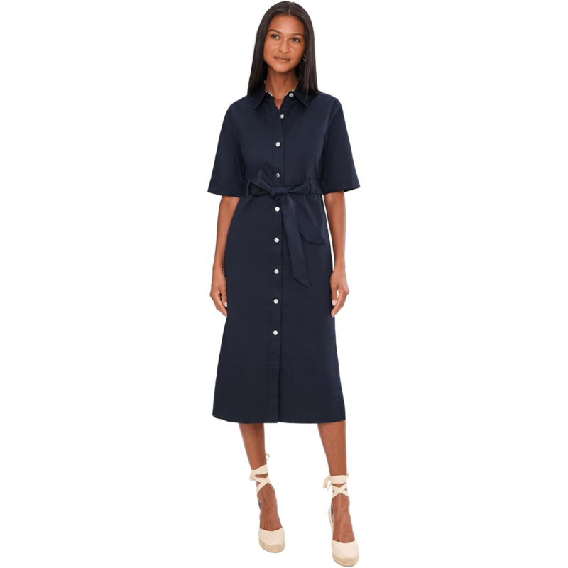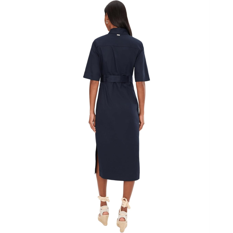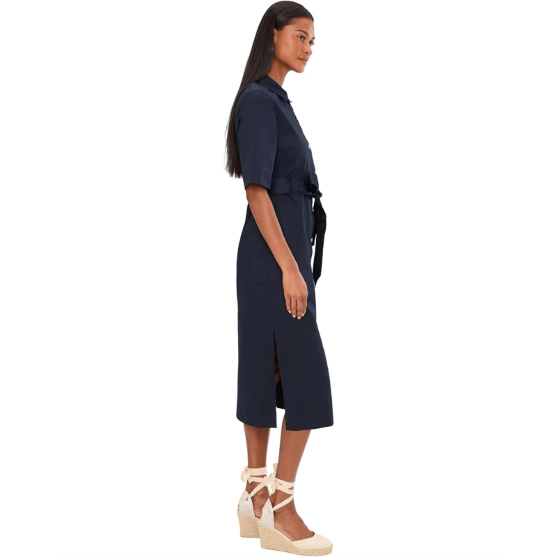 - The Barbour Sloane Midi Dress is crafted from cotton sateen for a smooth, refined finish. It features a pointed collar, short sleeves, and branded shank buttons along the front placket, giving it a tailored yet relaxed look. A self-fabric belt cinches the waist for definition, while deep side splits add movement and ease. Finished with a slim ID bar at the waistband, this midi dress blends comfort with signature detailing.