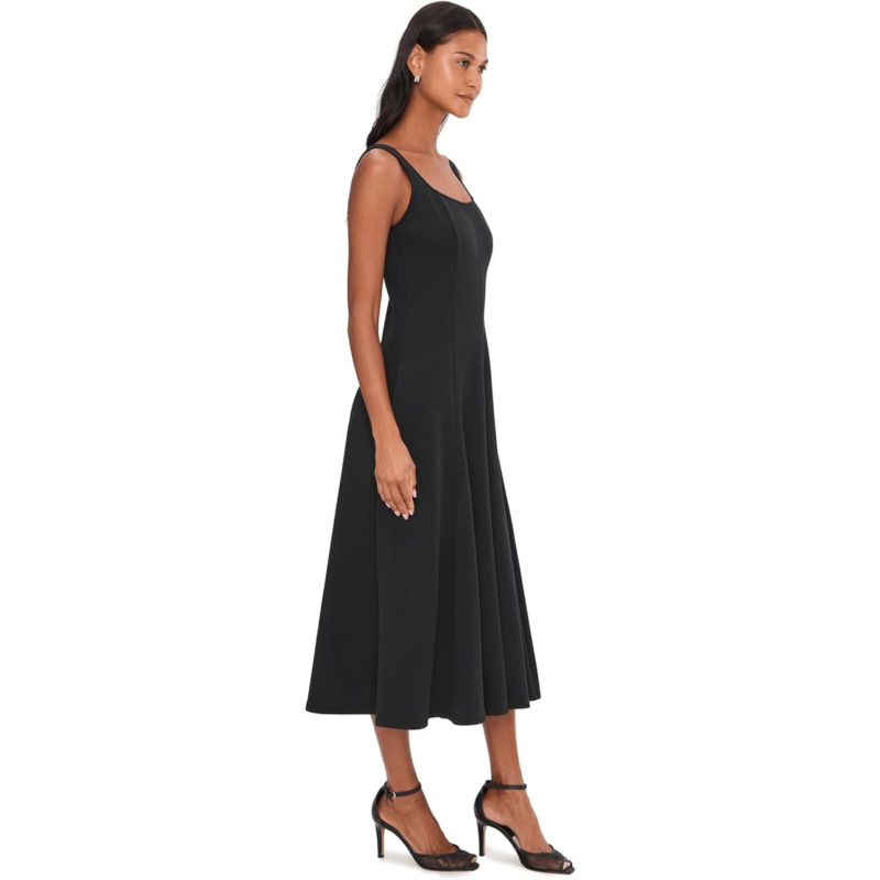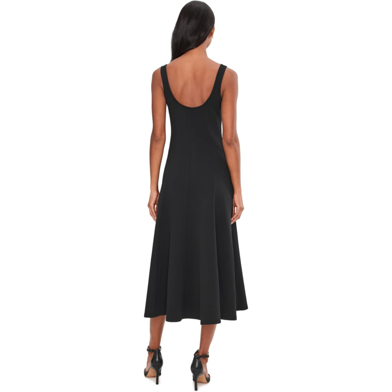 - The Vince Square Neck Seamed Dress is crafted from a double-knit cotton blend with a subtle textural pique finish. The seams have been strategically placed to softly follow the form, from the slim bodice to the gently flared skirt. It is styled with a square neckline and a pleated hem. This sleeveless, midi dress is a great choice for formal events and parties.