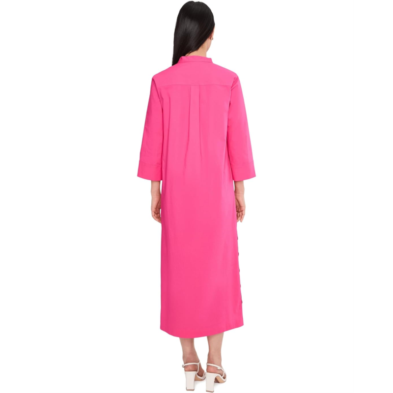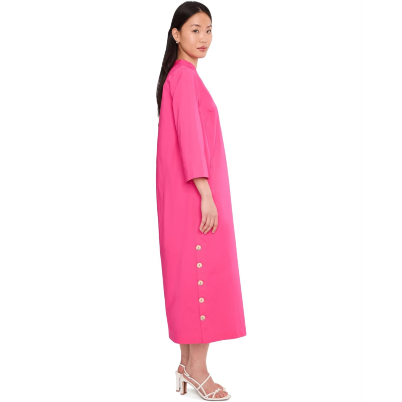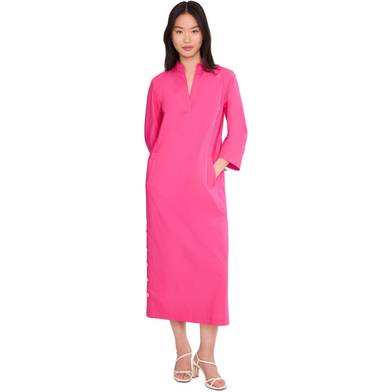 - The Trina Turk Capella Dress is an easy shift silhouette dress with a V-neckline, a midi length, and side slits with gold button detail. Made from a cotton blend, it is styled with elbow-length sleeves and a straight hem. This midi dress is a great choice for casual outings and parties.