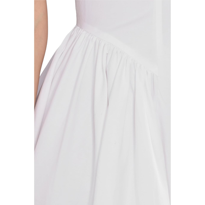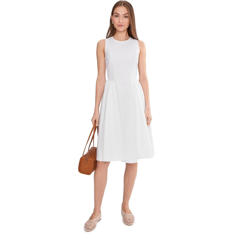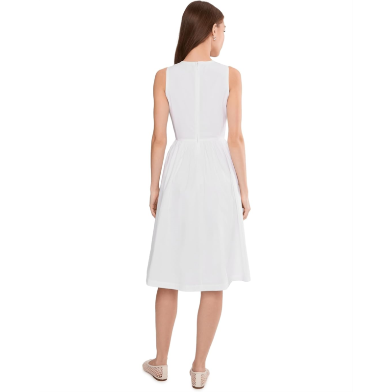 - The Trina Turk Lombardy Dress features a full A-line skirt with side pleating at the waist and hits at the knee. It is designed with a round neckline and zippered center-back closure.
