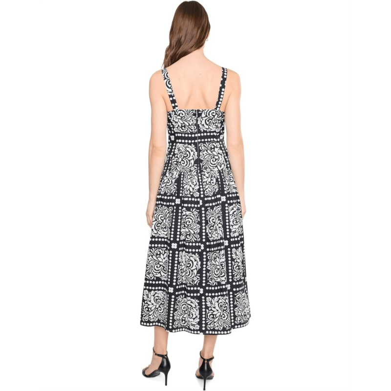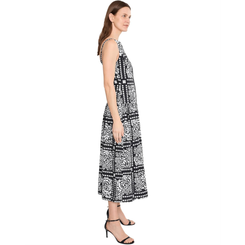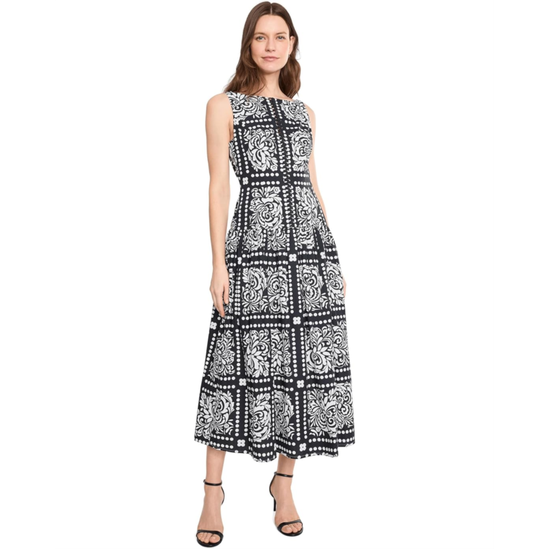 - Crafted from crisp cotton, this Adrianna Papell Drop Waist Midi Dress showcases a relaxed drop-waist A-line silhouette with an airy, effortless drape. A vibrant tile print brings eye-catching dimension, while open braided trim along the bodice adds a hint of artisanal charm. The wide boat neckline beautifully frames the face, enhancing its feminine appeal. Sleeveless and easy to wear, this polished yet laid-back style is perfect for sunny escapes, outdoor lunches, and leisurely weekend strolls.