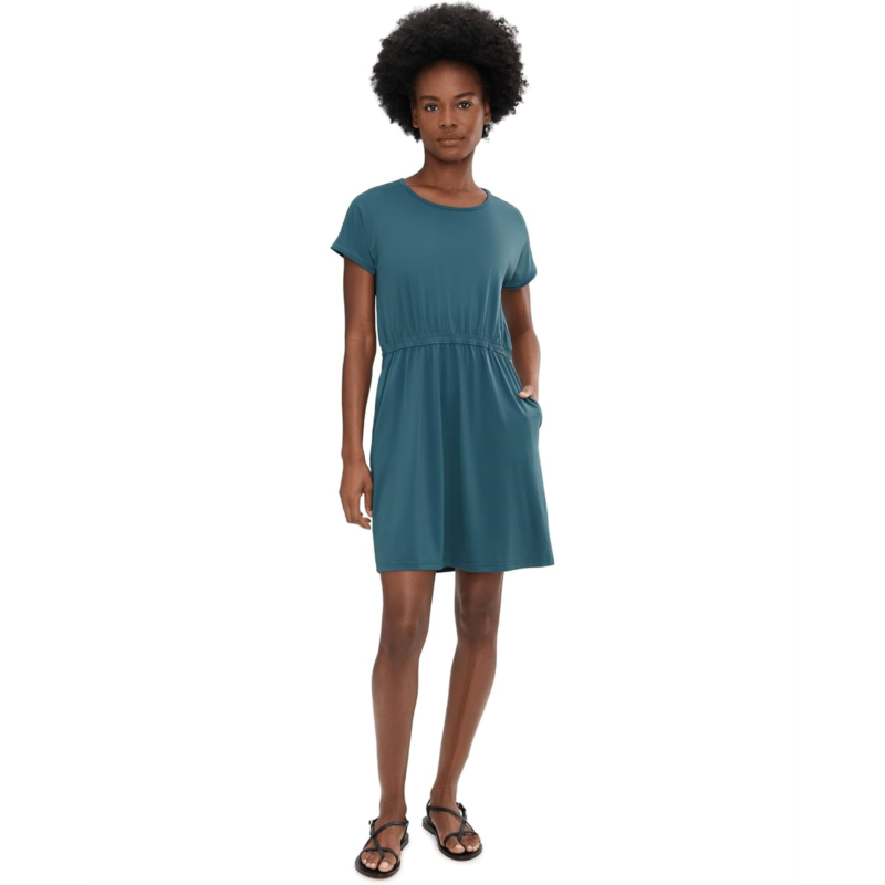 - The Columbia Chill River Short Sleeve Dress has wicking power, skin-cooling technology, and built-in UPF 50 sun protection. Its lightweight and versatile, with just-right stretch and pockets. This knee-length dress is made from a special fabric design that enables heat release with blue rings that react with sweat to lower the temperature of the fabric so you feel cooler, while it wicks away moisture. Designed to keep you cool, this dress is made from a light and stretchy polyester fabric in an active cut that moves with you. This casual dress is styled with short sleeves, a crew neckline, and a straight hem. It offers ultimate protection in moderate to extreme sunlight with superior protection against sunburn. More effective on covered areas than sunscreen with more protection against the broad spectrum of harmful UVA and UVB sun rays. The Omni-Wick fabric moves perspiration away from the skin to dry quickly on the surface, keeping you comfortable and dry. From weekday to weekend, this short-sleeve dress is an essential, and it has pockets.