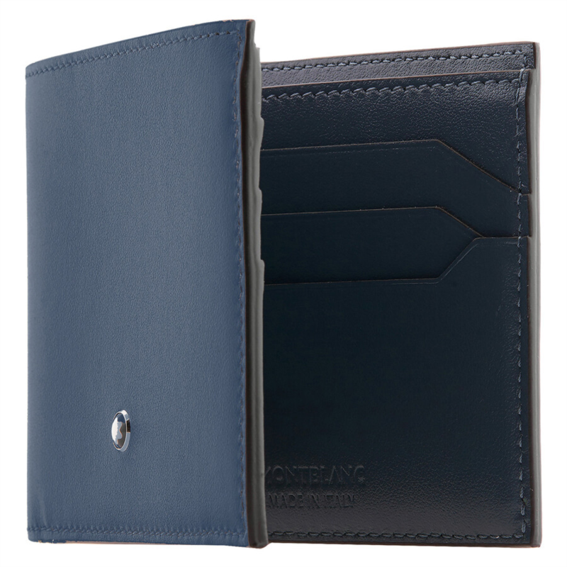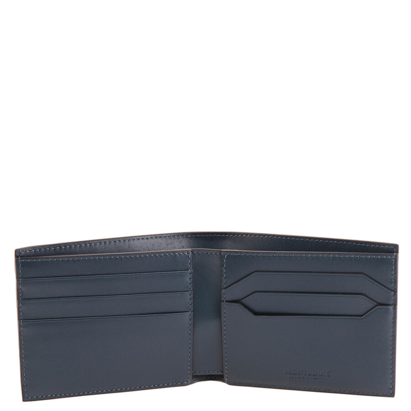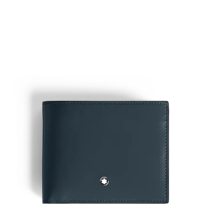 Montblanc Wallets. SKU: 220446. Montblanc Meisterstuck Wallet 6Cc. Slim, stylish, and timeless, this classic bifold wallet is crafted from luxurious velvet blue Meisterstuck calfskin leather. Designed for everyday elegance, it features six credit card slots, two compartments for banknotes, and two additional pockets for receipts. The subtle Montblanc emblem on the front completes the refined look. Details: Material: Meisterstuck calfskin leather. 6 credit card slots. 2 banknote compartments, 2 additional pockets for receipts. Subtle Montblanc emblem on front. Dimensions: 4.5 x 0.4 x 3.5 in.