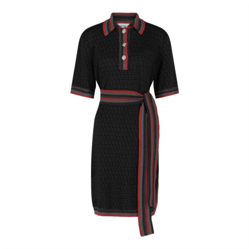 Ferragamo Ladies Dresses. SKU - 111377 754542. Color - Black. Ferragamo Gancio Quarter-Button Jacquard Dress. Black jacquard dress with a multi-colored belted waist, featuring a slip-on design with a quarter-button placket and classic collared neckline. Glitter accents highlight the button closure and sleeve cuffs, with the Gancio logo on buttons and a front patch pocket. Regular fit for versatile styling. Materials - Main - 63% Wool, 27% Rayon, 7% Metallized Polyester, 2% Polyamide, 1% Polyurethane. Contrast - 74% Rayon, 19% Metallized Polyester, 5% Polyamide, 2% Polyurethane. Dry clean only. Made in Italy.