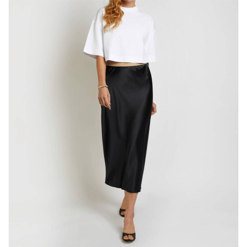 Tuck your favorite tee into this midi length skirt for an effortlessly cool look.Versatile piece designed for the multirole woman. Crafted from 100% silk. Midi-length skirt offers a luxurious drape and features an elasticated waist for an easy slip-on design. Reversible design expands styling possibilities. Effortlessly transitioning from sand to black. Embroidered with a distinctive JR logo at the waist. Embodies opulence and modernity, making it an essential addition to any wardrobe.